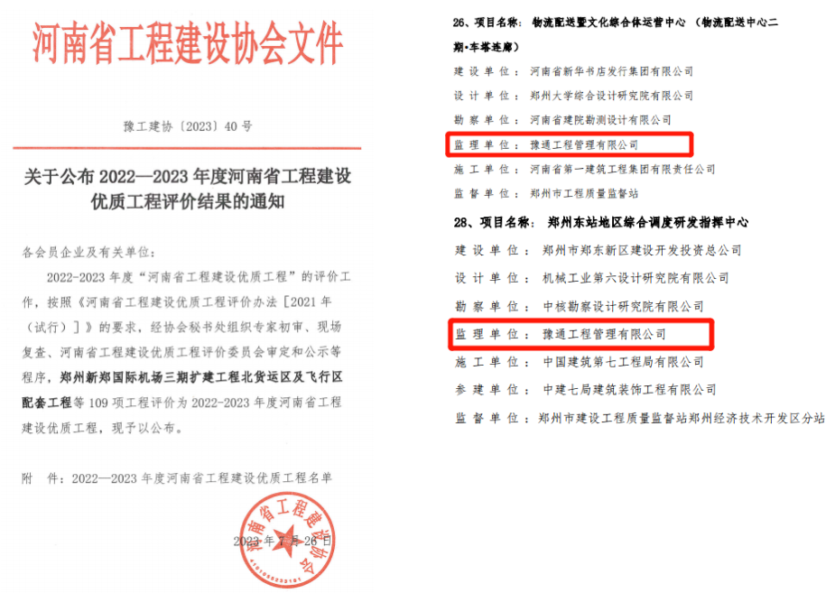 近日,河南省工程建設(shè)協(xié)會發(fā)布了《關(guān)于公布2022-2023年度河南省工程建設(shè)優(yōu)質(zhì)工程評價結(jié)果的通知》,由我公司負責(zé)監(jiān)理的2個項目——鄭州東站地區(qū)綜合調(diào)度研發(fā)指揮中心項目、物流配送暨文化綜合體運營中心(物流配送中心二期·車塔連廊)獲評“河南省工程建設(shè)優(yōu)質(zhì)工程”。